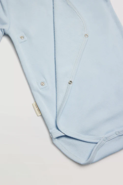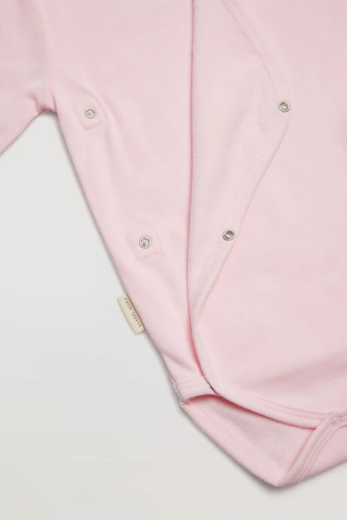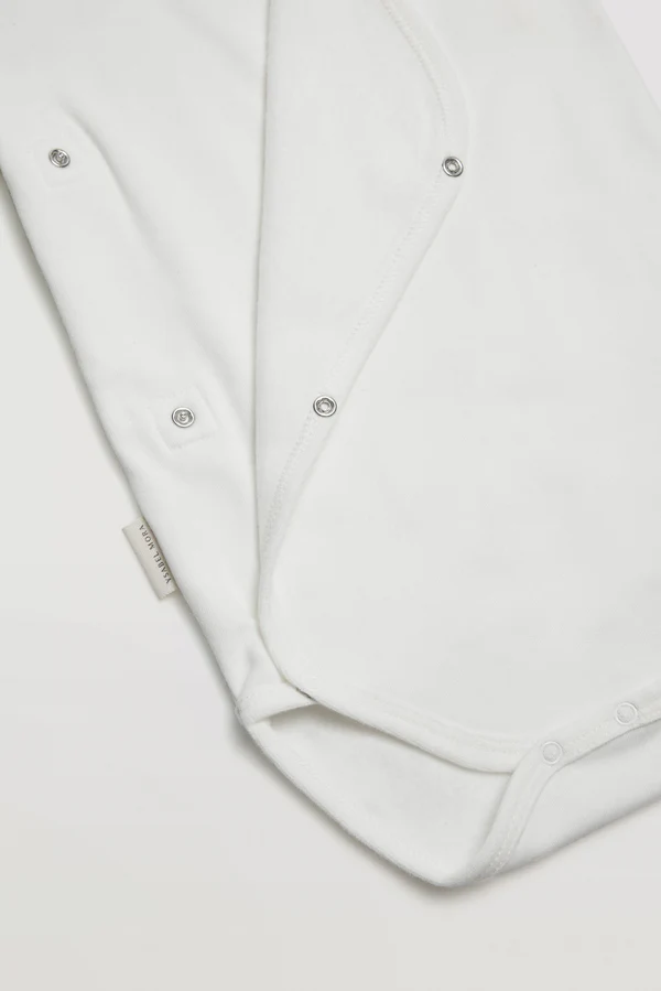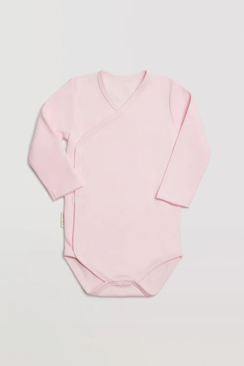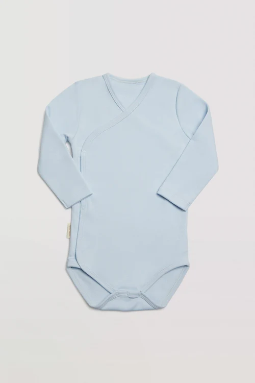 Body de manga comprida para bebé em algodão natural. Body cruzado, com decote em V. Peça confeccionada em tecido macio e agradável.